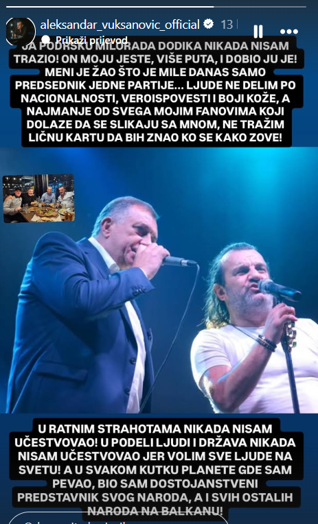 On je naglasio da nije bilo loše namjere i da je fotografija nastala na proslavi u kući zajedničkog prijatelja. “Volim Acu, poštujem njegov rad i njegove pjesme, jednostavno volim da slušam čovjeka kako pjeva i to je sve. Vidim da se i Dodik oglasio i tražio da se zabrani Acin koncert. A zna Dodik da sam i ja bio dobar za njega i zvao ga kada sam mu trebao. On dobro zna o čemu pričam”, ustvrdio je Orić.
