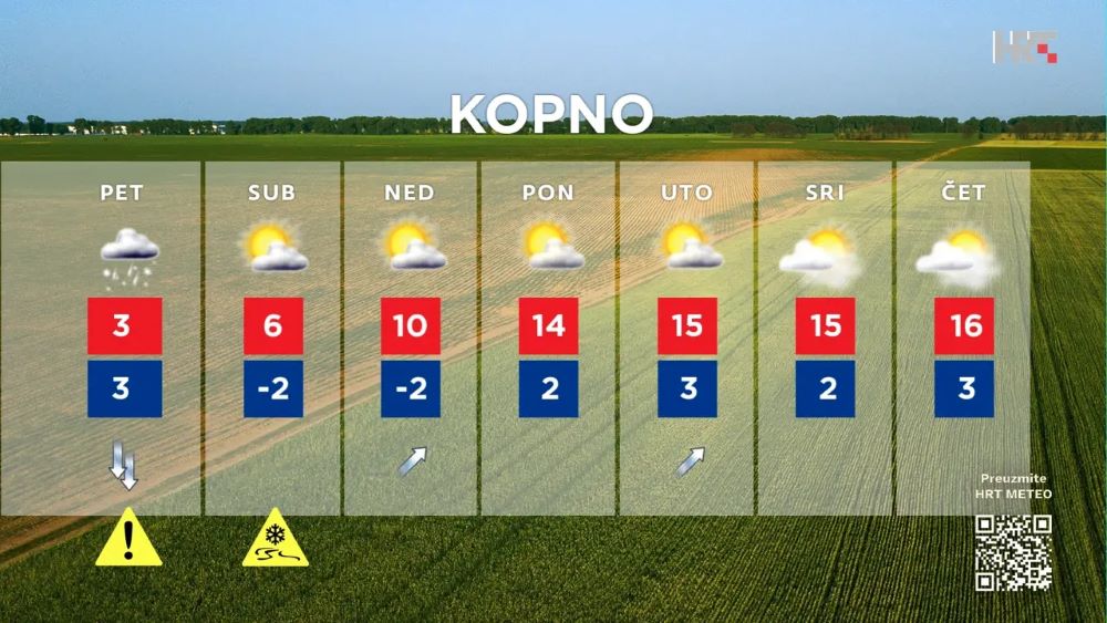 “Na istoku Hrvatske u noći i u subotu ujutro i dalje će biti malo snijega ili padavina na granici kiše i snijega. Zatim će biti pretežno oblačno, ali mjestimice u drugom dijelu subote može biti slabe kiše uz mogućnost snježnih pahuljica. Vjetar će ponegdje biti umjeren sjeverozapadnog smjera, a temperatura uglavnom od 0 do 5°C”, rekao je.