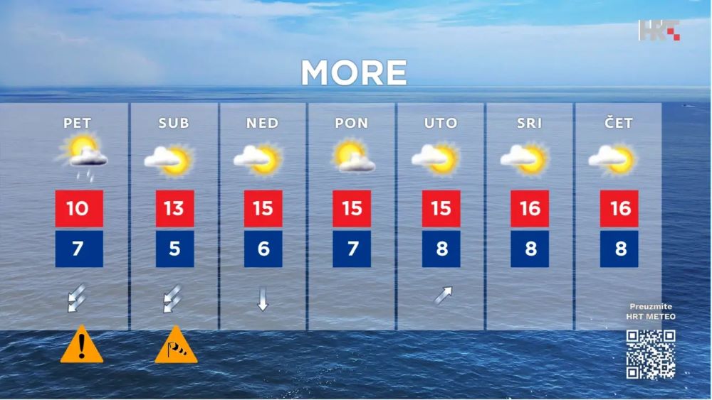 “U većem dijelu Dalmacije dnevna temperatura od 9 do 14 °C, a jutarnje između 2 i 7 °C. Uz pretežno sunčano vrijeme bura će oslabiti i okrenuti na sjeverni i sjeverozapadni vjetar. A na krajnjem jugu Hrvatske u prvom dijelu dana jaka bura s olujnim udarima, a zatim sjeverni, sjeverni, sjeverni, sjeverni, sjeverni, sjeverozapadni vjetar. otvorene i valovite.